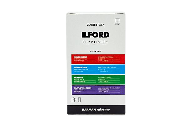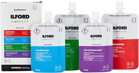The ILFORD SIMPLICITY Starter Pack contains all the photo chemicals you need to start processing your own black & white films. Each Starter Pack box contains: 1 x film developer, 1 x film stop bath, 1 x film fixer and 1 x film wetting agent in simple, single-use sachets.